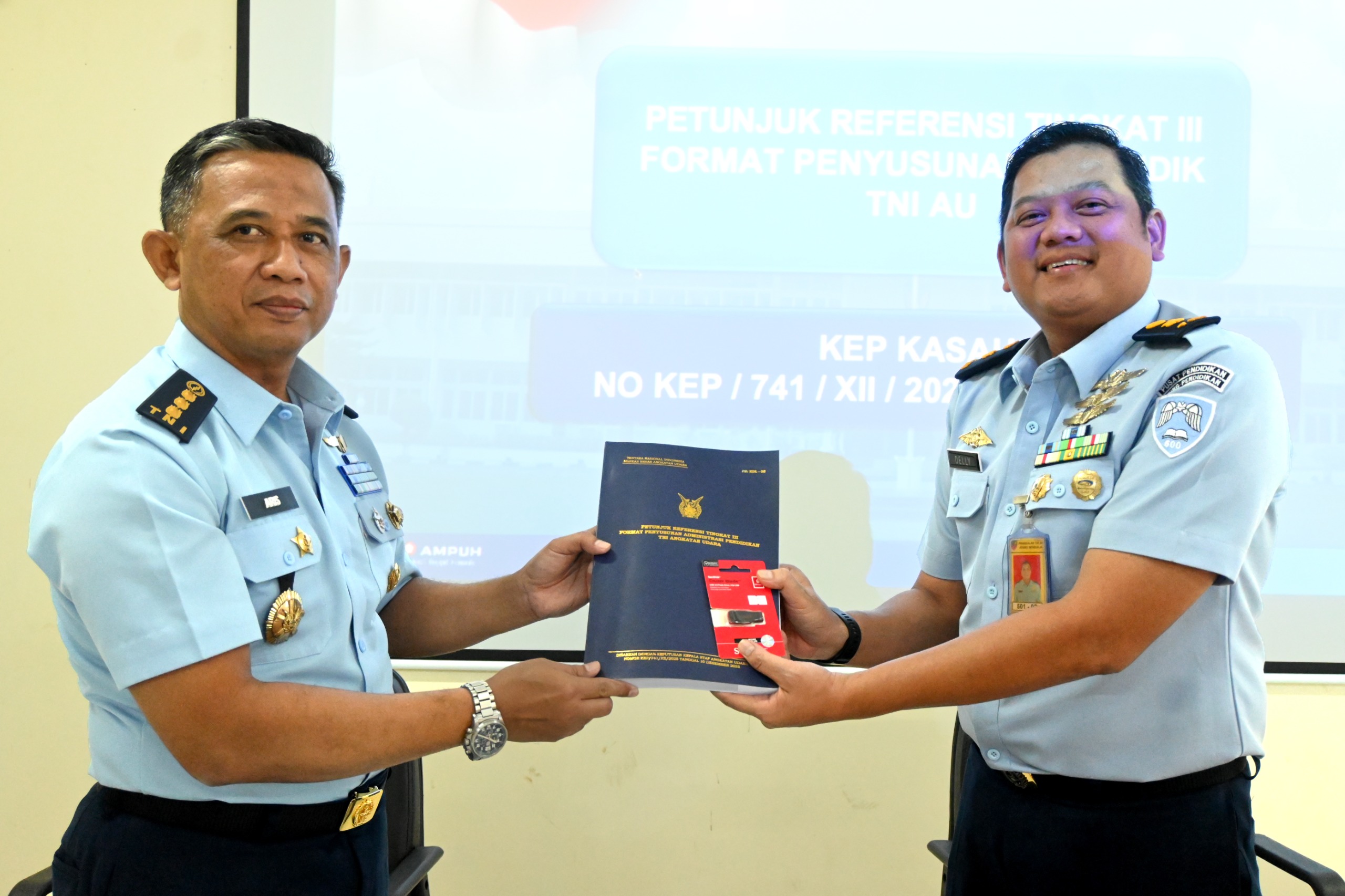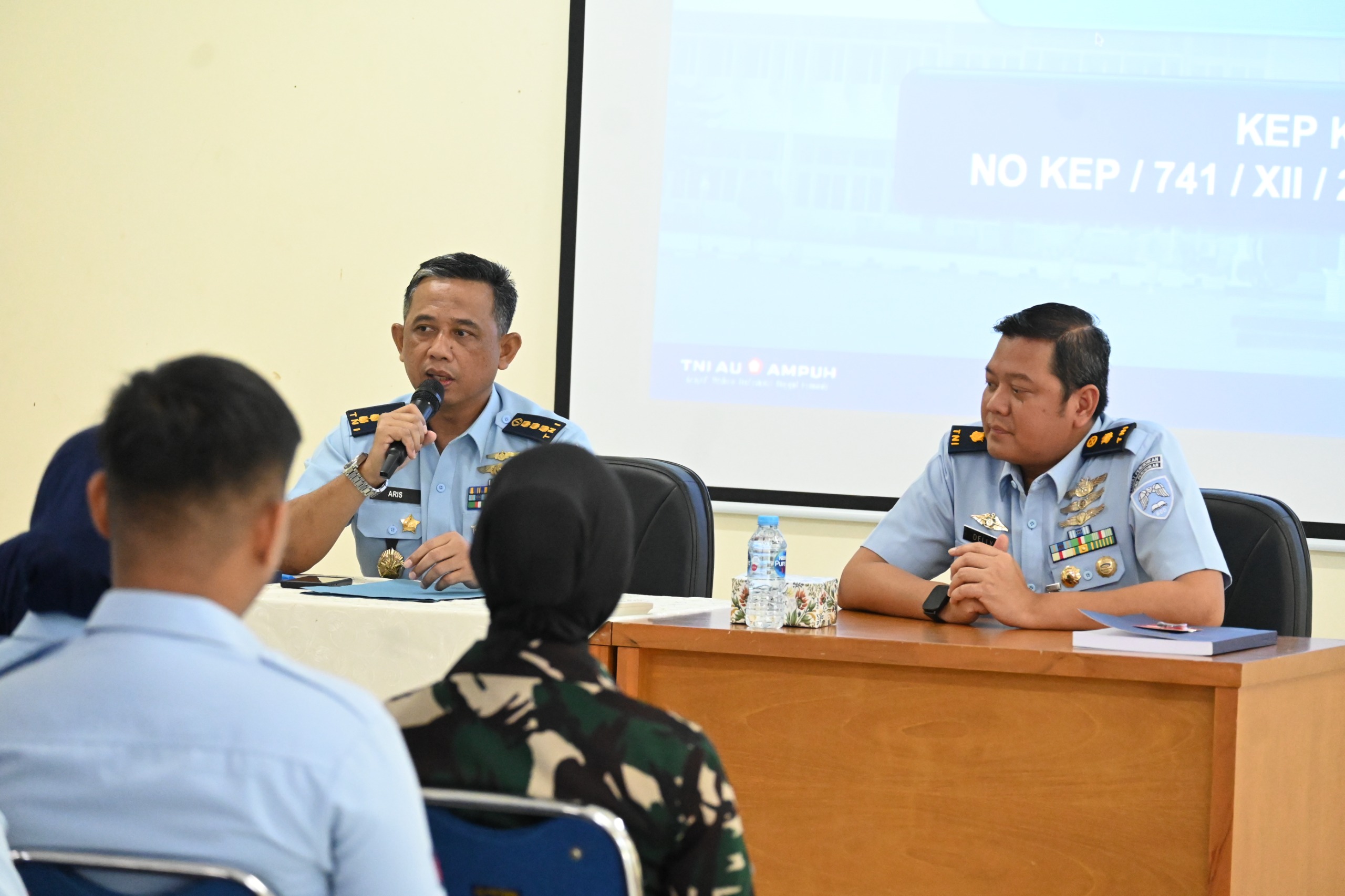 Kasi Evaldik Opsdik Wingdik 500/Umum Mayor Adm Dely mendampingi Paban IV/Mindik Ditdik Kodiklatau Kolonel Lek Aris Setianta dalam kegiatan Bimbingan Teknis Petunjuk Referensi Tingkat III Format Penyusunan Administrasi Pendidikan yang berlangsung di Aula Skadik 501 Wingdik 500/Umum. Kegiatan ini diikuti oleh peserta dari personel Wingdik, Skadik 501, Skadik 503, dan Skadik 506. (10/02/2026).
